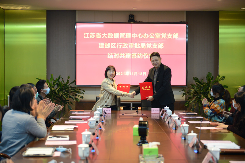 发布日期:2021-11-22 15:47 来源:办公室 字体:[ 大 中 小 ]为深入践行“两在两同”,切实加强党建工作优势互补,提升党建工作整体水平,11月18日,省政务办党组成员、省大数据管理中心党委书记赵明和办公室党支部全体党员一起赴建邺区开展专题调研暨党支部共建主题党日活动。